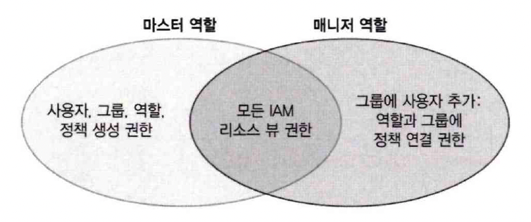 - 마스터 : 사용자, 그룹, 역할, 정책을 생성할 수 있는 권한을 부여한다.