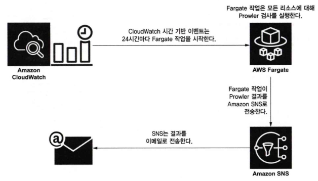 - 서버리스 컴퓨팅인 AWS Fargate 작업이 시작되어 컨테이너 내에서 Prowler 검사를 전체 리소스 대상으로 실행한다.