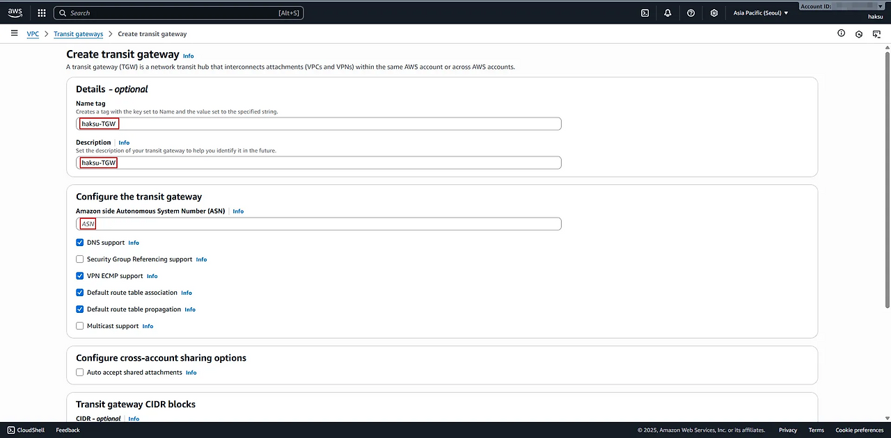 Default or 64512-65535 or 4200000000-4294967294 중 선택하여 생성 가능Amazon side Autonomous System Number(ASN) The Autonomous System Number (ASN) for the AWS side of a Border Gateway Protocol (BGP) session. You can use the default ASN, or you can specify a private ASN in the 64512-65534 or 4200000000-4294967294 ranges.