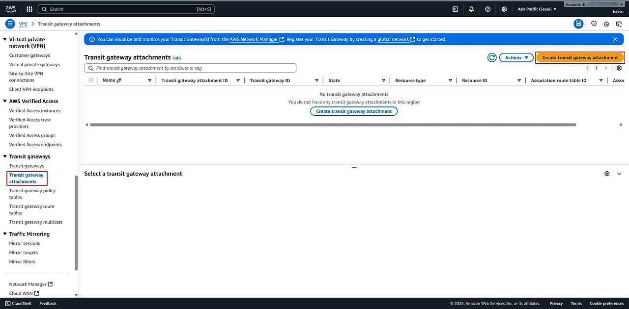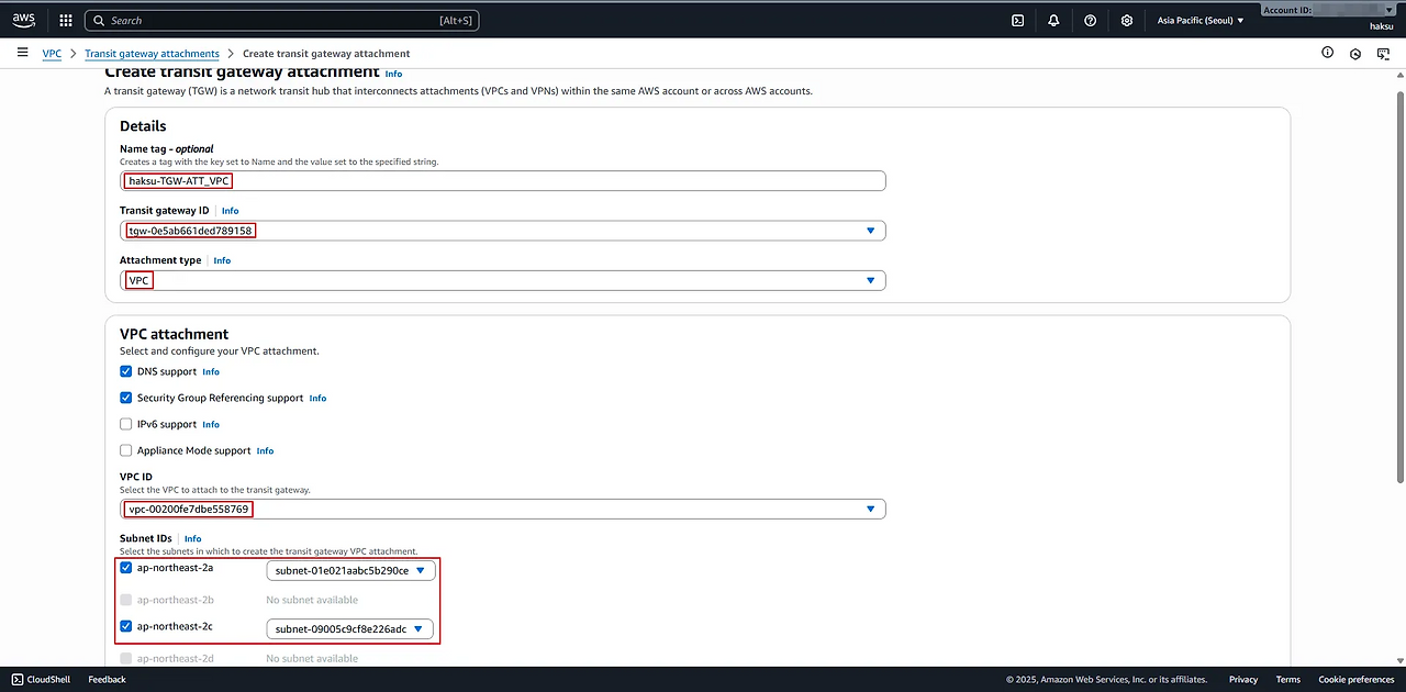 VPC → Transit gateway attachments → Create transit gateway attachment