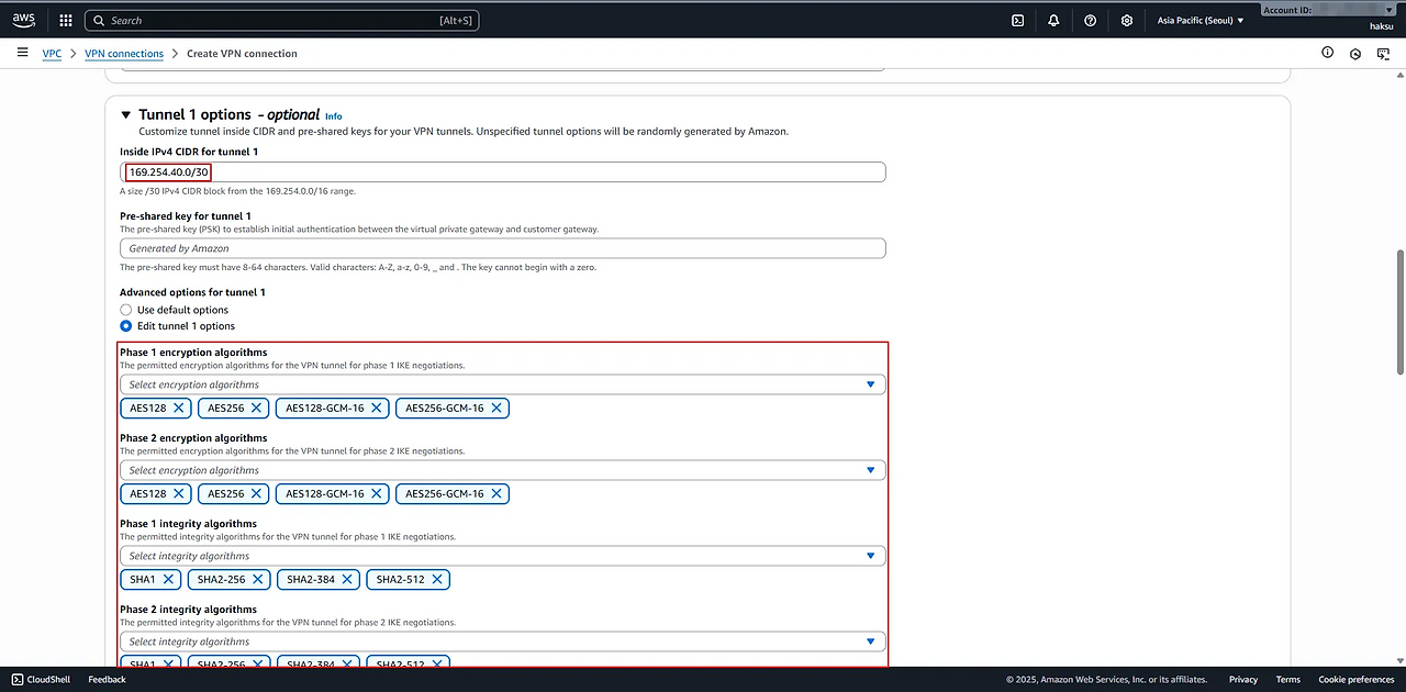 /30 Subnet을 선택해야 하는 이유는 VPN 터널 내부에서 단 두 개의 IP만 필요 - Advanced options for tunnel 1 : Phase 1, 2에서 사용할 알고리즘 선택