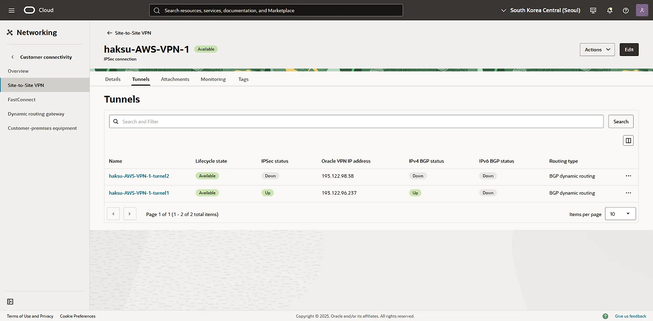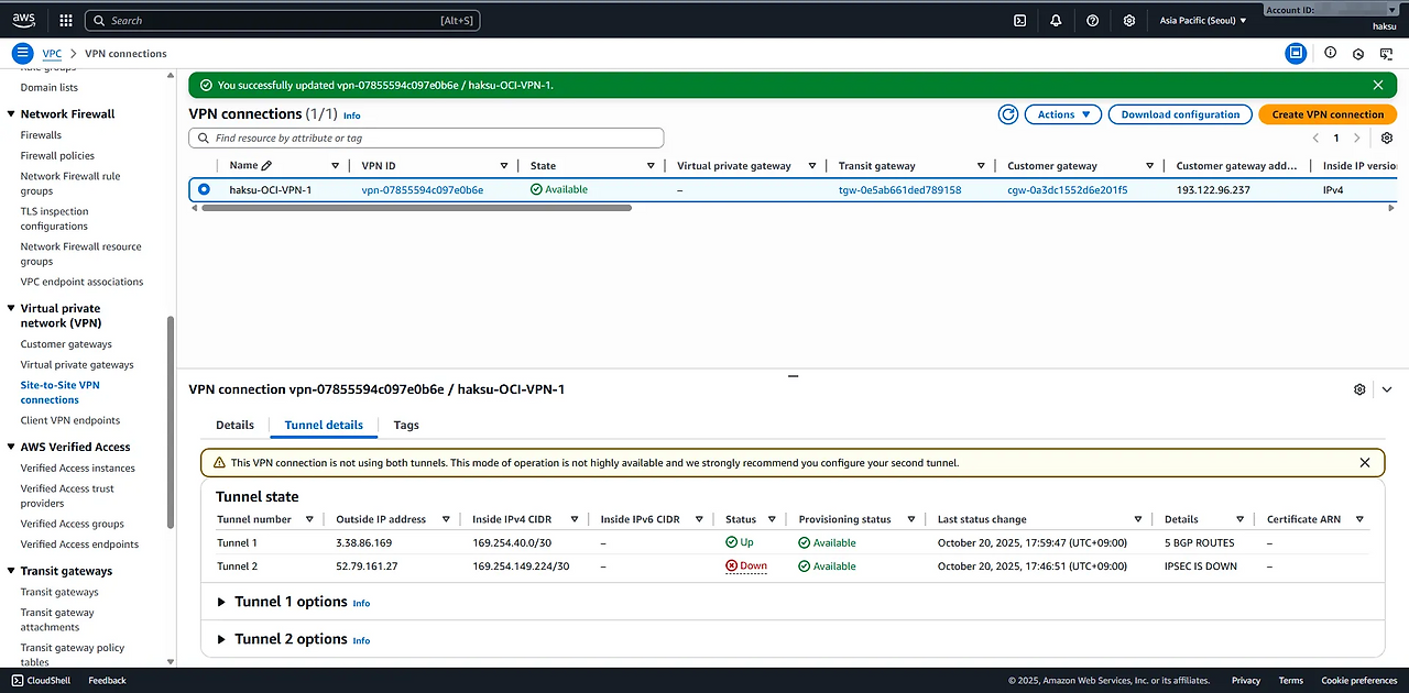 [Multi Cloud] AWS-OCI VPN tunnel 이중화 (BGP)_5.결과 확인 Posted Oct 25, 2025 Updated Jan 3, 2026 By haksuperman views 1 min read [Multi Cloud] AWS-OCI VPN tunnel 이중화 (BGP)_5.결과 확인 Contents [Multi Cloud] AWS-OCI VPN tunnel 이중화 (BGP)_5.결과 확인 5.1. AWS VPN 및 BGP State5.2. OCI VPN 및 BGP State CLOUD, MULTICLOUD aws oci vpn tunnel bgp asn duplication This post is licensed under CC BY 4.0 by the author. Share