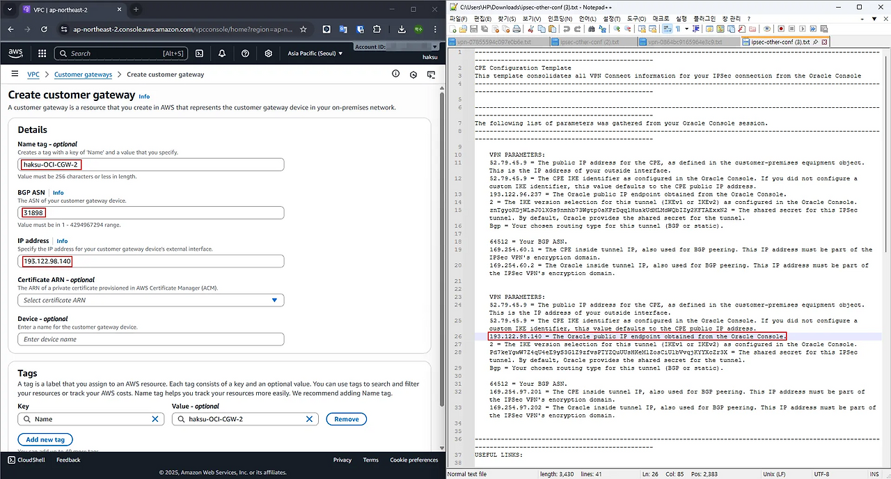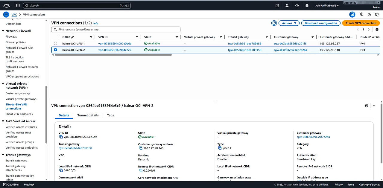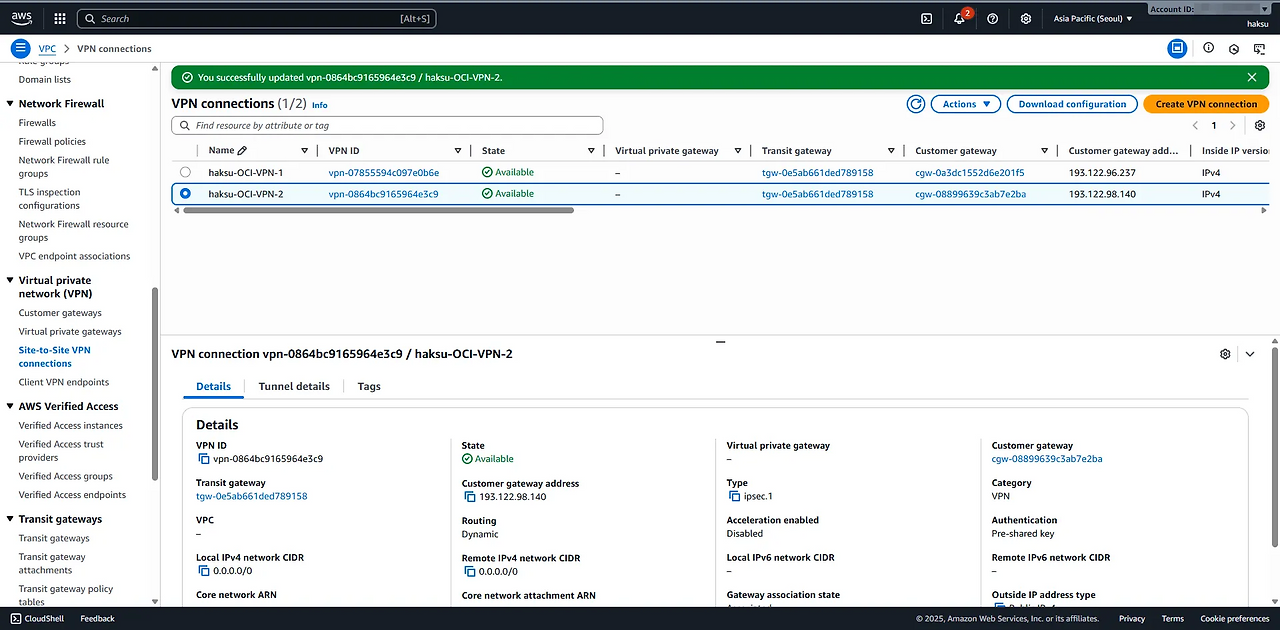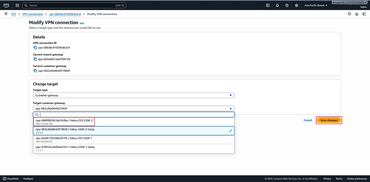 [Multi Cloud] AWS-OCI VPN tunnel 이중화 (BGP)_8.AWS-OCI VPN2 구성(AWS)