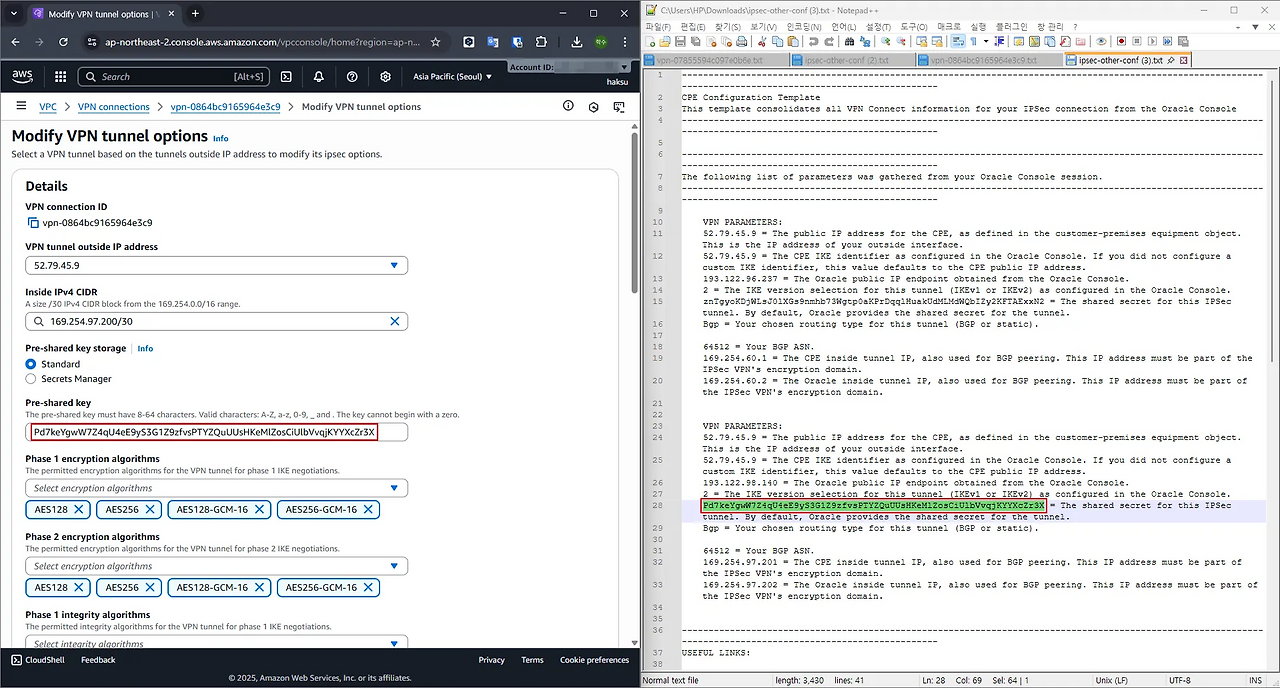 AWS 측과 OCI 측의 PSK 유효 조건이 다름