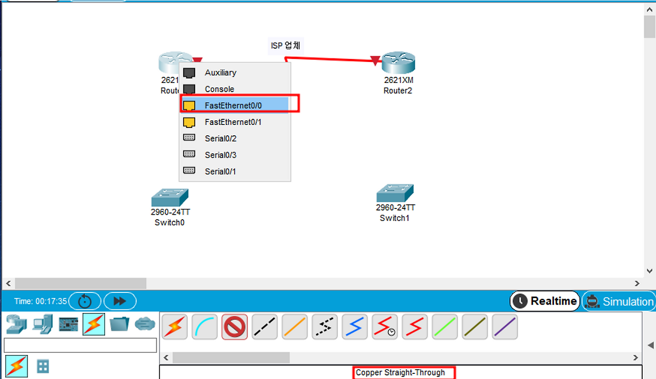 라우터와 스위치 연결은 다이렉트 케이블 연결(스위치-논스위치 연결)