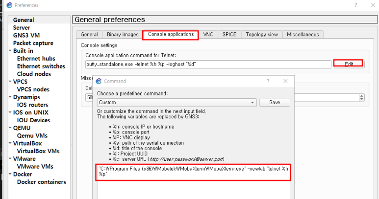 경로 수정 -> GNS3에 MobaXterm 프로그램 연동