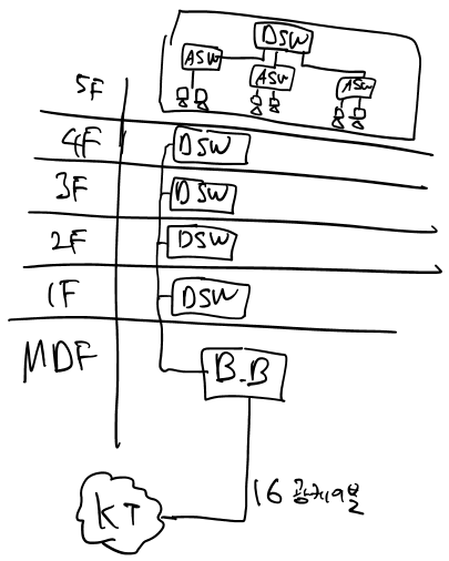 -> 하나의 사옥이라면 각 층마다 광케이블을 넣지 않고 백본 스위치(코어 스위치)에서 랜으로 넣으면 되지만, 각 층마다 다른 업체들이라면 MDF실에 광 포트가 많은 백본 스위치를 두고 각 층에 광케이블을 넣는 방법이 있음 (업체별 이외의 층이 높은 건물의 경우도 랜(최대 100M)으로 해결이 안됨)
