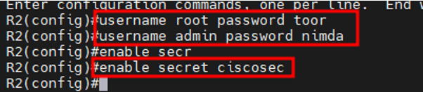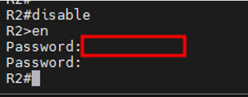 사용자 계정 만든 후 enable secret 을 지정해 enable 들어갈 때 해당 패스워드 입력 요구 * 콘솔 보안 : 콘솔(모니터, 키보드 등 작업 환경) 창에 입력하는 패스워드 보이지 않도록