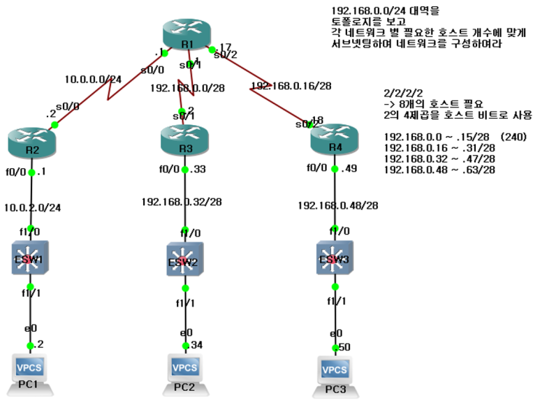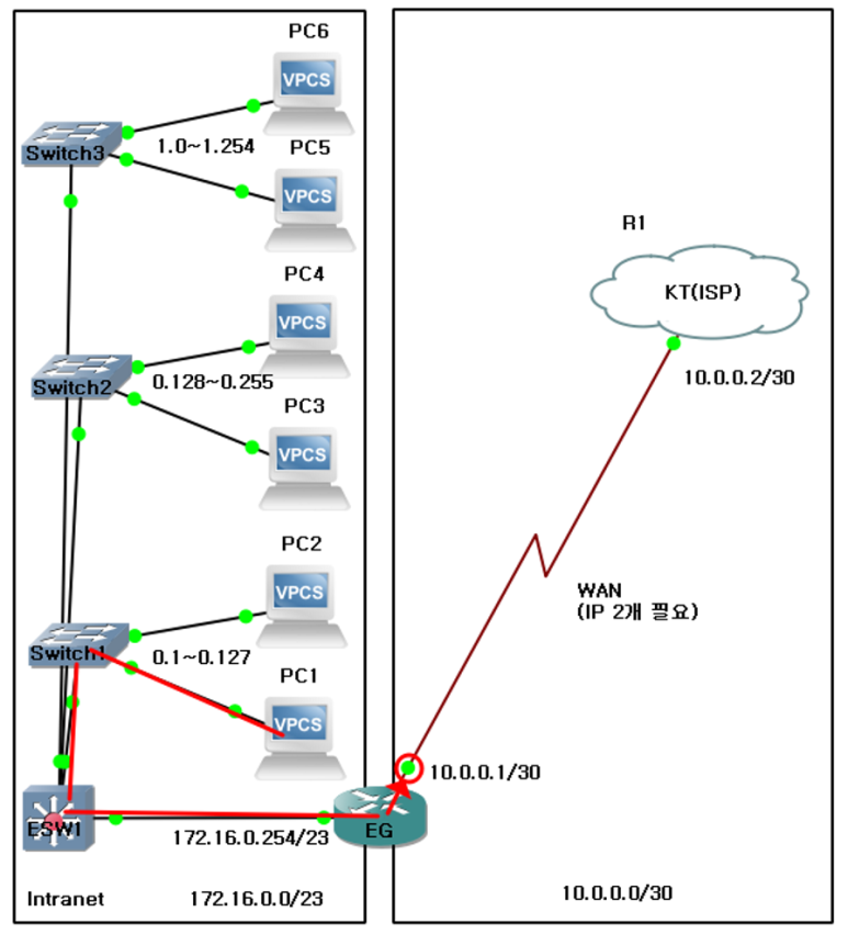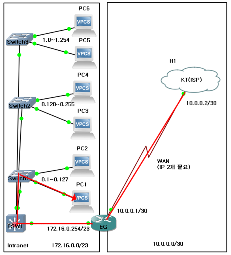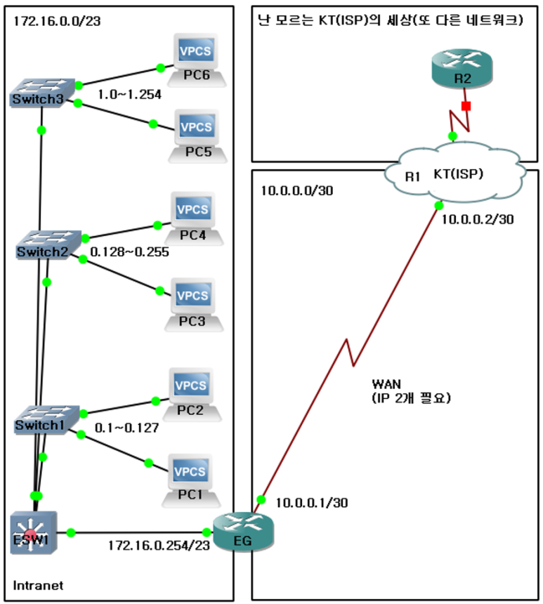 모든 장비(호스트PC)에 IP 부여 후 전 장비 통신 가능하도록 라우팅하여라 -> R1 KT(ISP) 라우터에 172.16.0.0/23 네트워크 대역 라우팅이 이미 되어 있으니, PC들 ip만 부여하면 통신 가능함