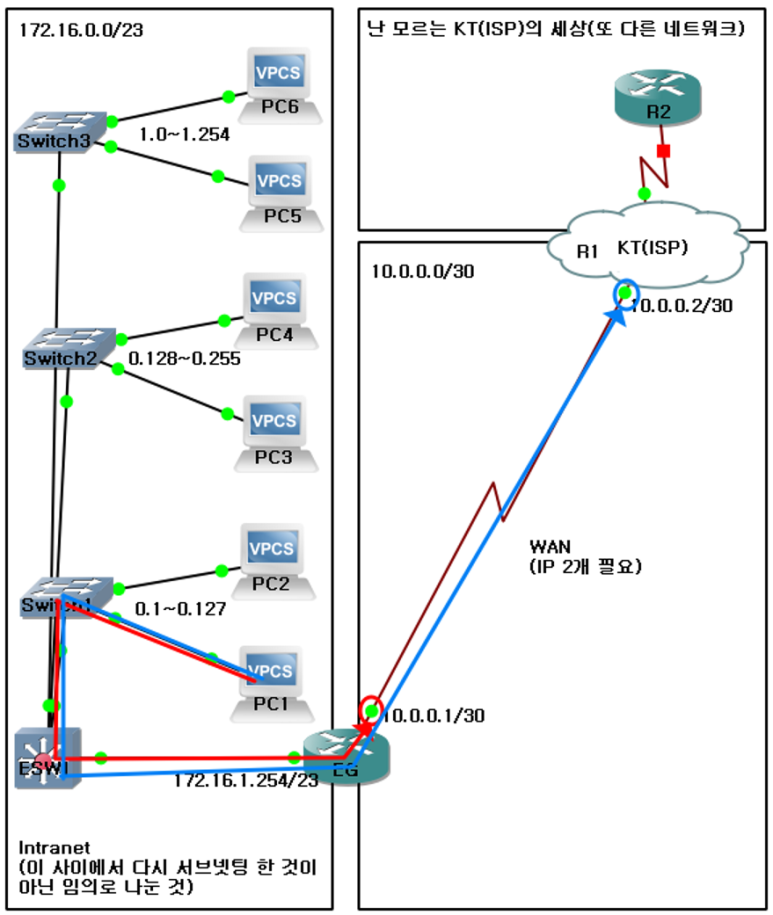 끝단 장비인 PC1에서 ping 10.0.0.1 가능(빨간 라인), 10.0.0.2 불가능(파란 라인) -> connected 라인이라 10.0.0.1 가능, 파란 라인은 패킷 돌아올 때 R1 KT(ISP) 라우터에서 172.16.0.0/23 대역을 몰라서 돌아오지 못함. 불가능