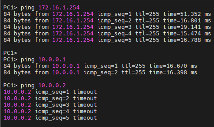 라우팅 테이블에 10.0.0.2/30 보내는 경로는 connected로 등록되어 있지만, PC1로 돌아오는 패킷의 정보가 없다 -> unreachable(아예 도달하지를 못함)이 아닌 timeout(도달은 했는데 돌아오지를 못함) 메시지가 출력되는 것 => 가는 경로, 돌아오는 경로 모두 등록되어 있어야 함!!