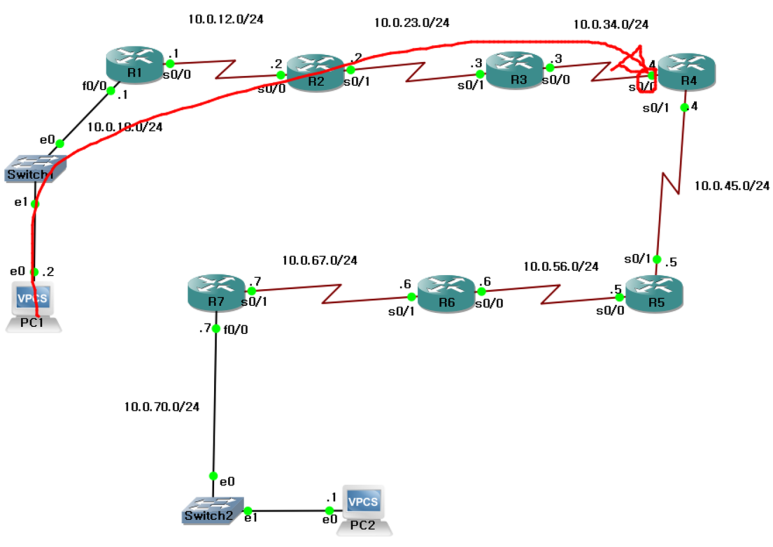 PC1(10.0.10.2/24) -> R4(10.0.23.4/24)