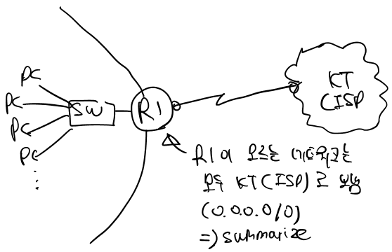 내부 네트워크의 라우터에서도 디폴트 게이트웨이처럼 모르는 네트워크(Unknwon Network)에 대해 모두 KT(ISP)로 보냄