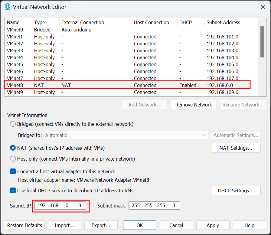 (VMware Workstation Pro를 사용하는 경우는 Edit 탭 - Virtual Network Editor로 설정하면 됨)