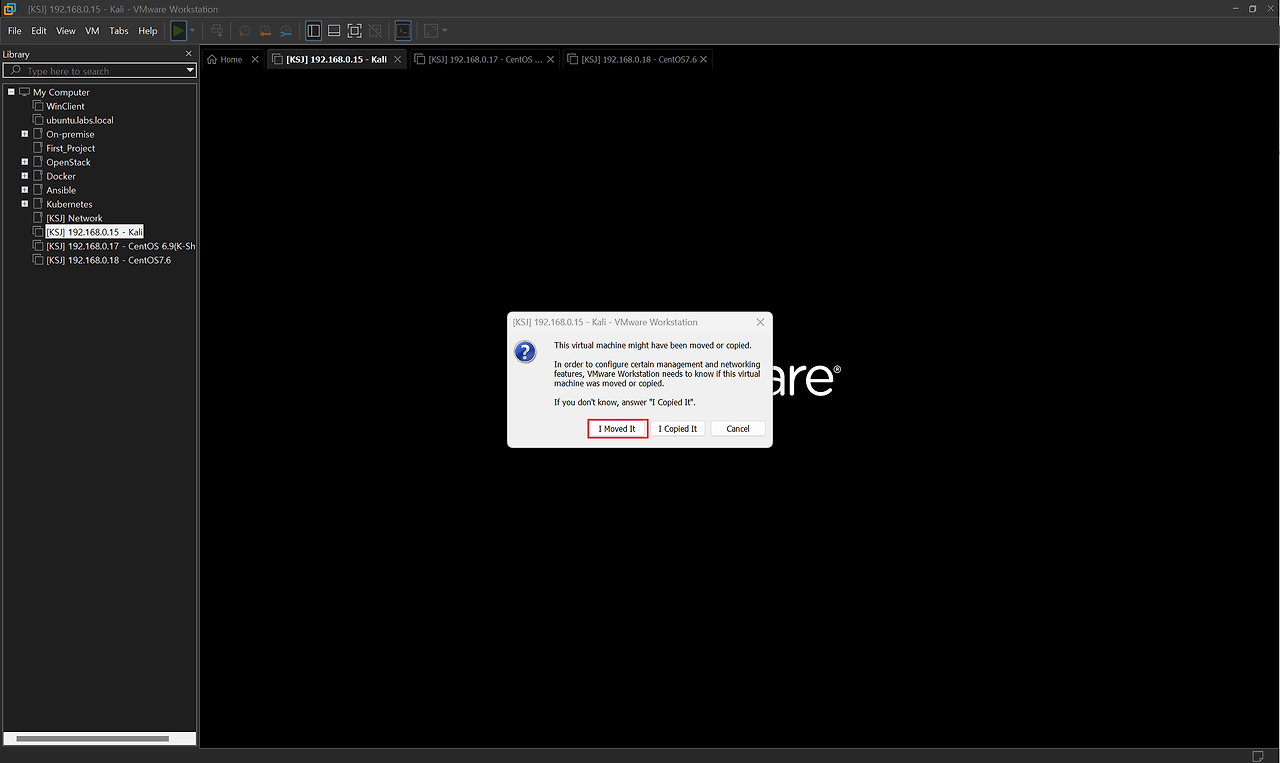 - I Copied It : VMware는 가상 머신이 복사되었다고 가정하고, 새로운 고유 식별자(UUID)를 할당하여 네트워크 충돌을 방지