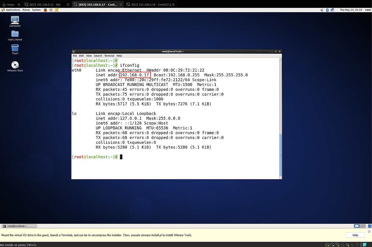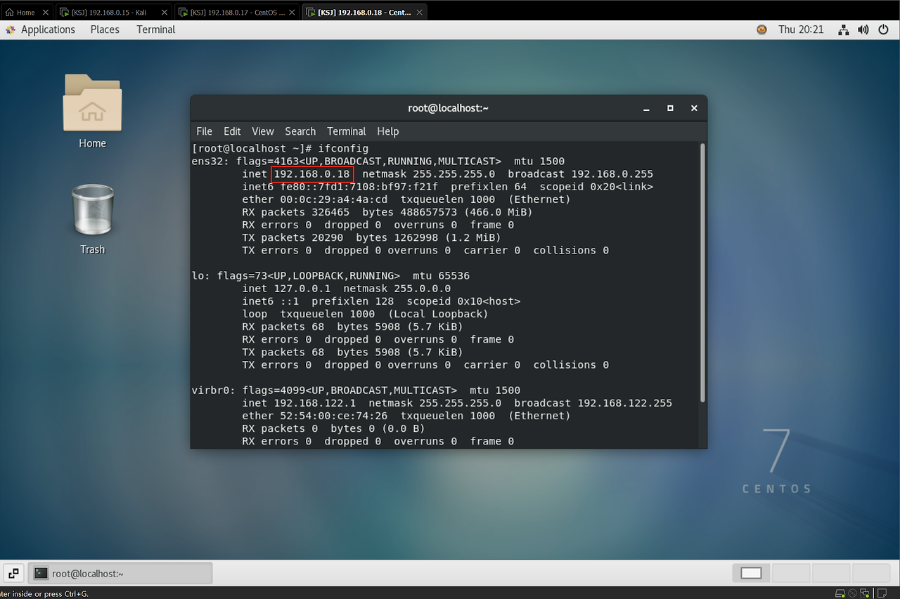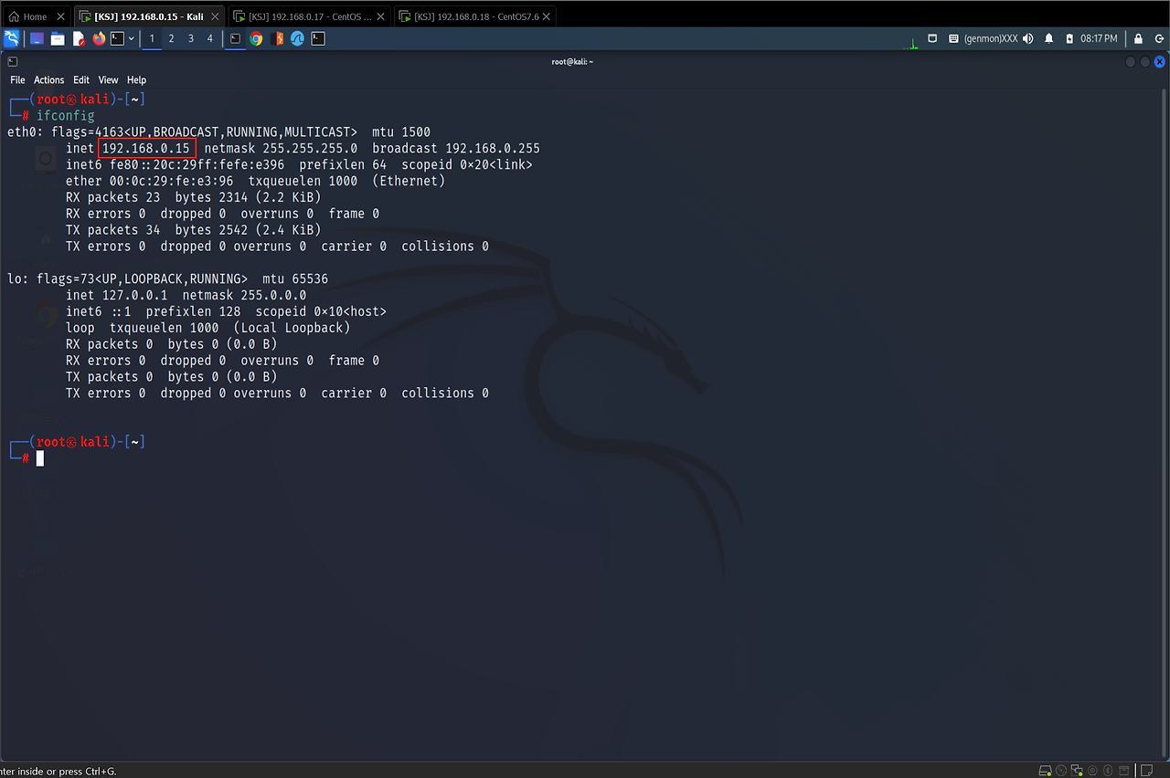3. 각 가상 머신(Kail, CentOS 6.9, CentOS 7) 내부 IP 확인