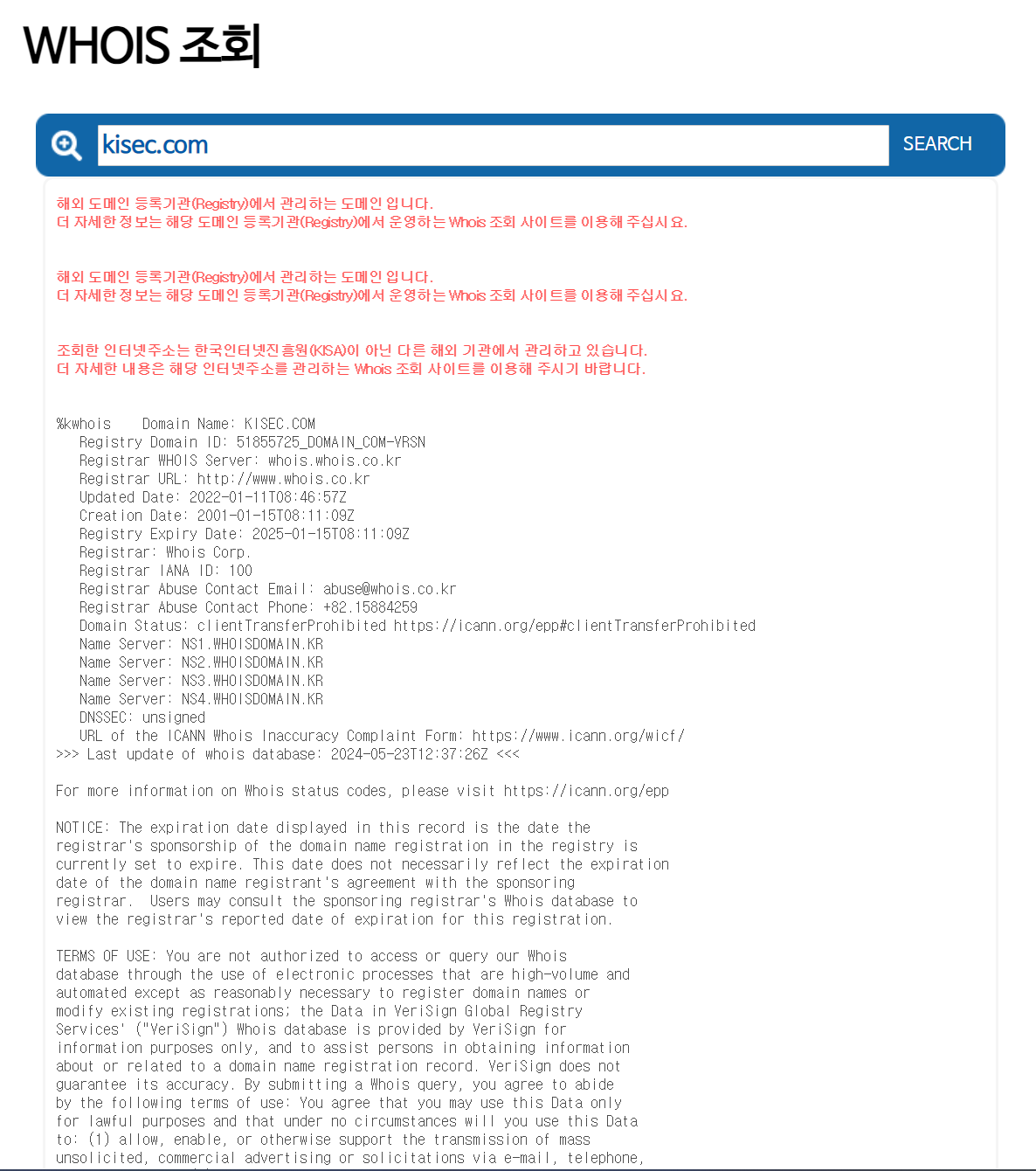 -> 보다 다양한 정보 획득 가능 - whois에서 kisec.com 질의 했을 때 결과