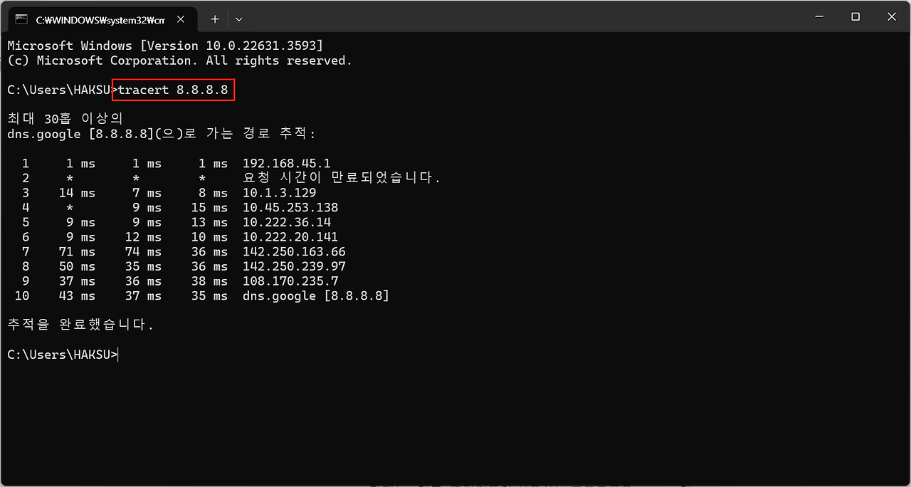 -> traceroute 자체는 7계층, 명령어들이 사용하는 프로토콜은 ICMP 3계층 - Windows 11에서 tracert 명령으로 8.8.8.8 질의 결과