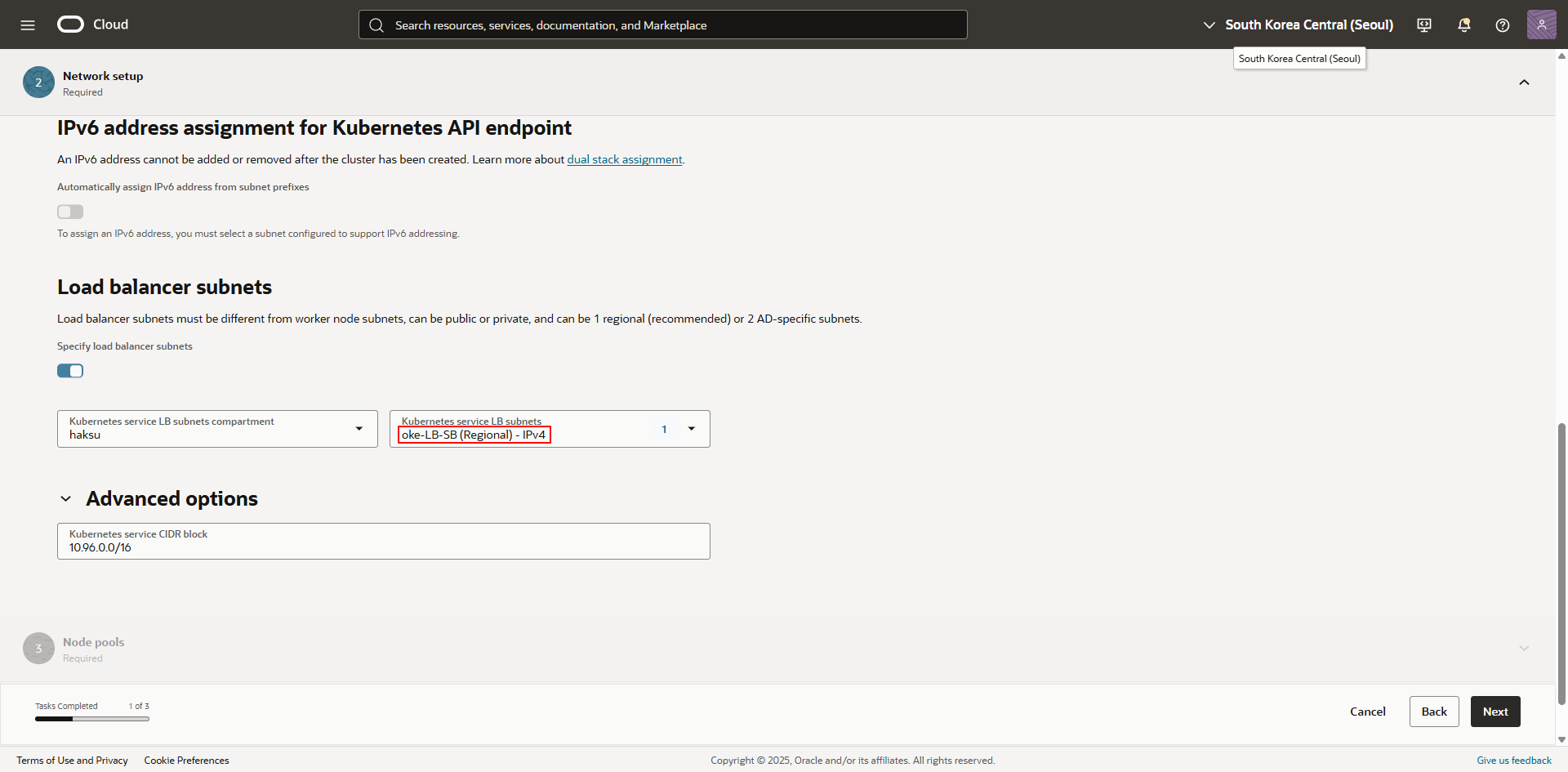 - Kuberentes service LB subnet : <이전 가이드에서 생성한 LB용 Subnet>