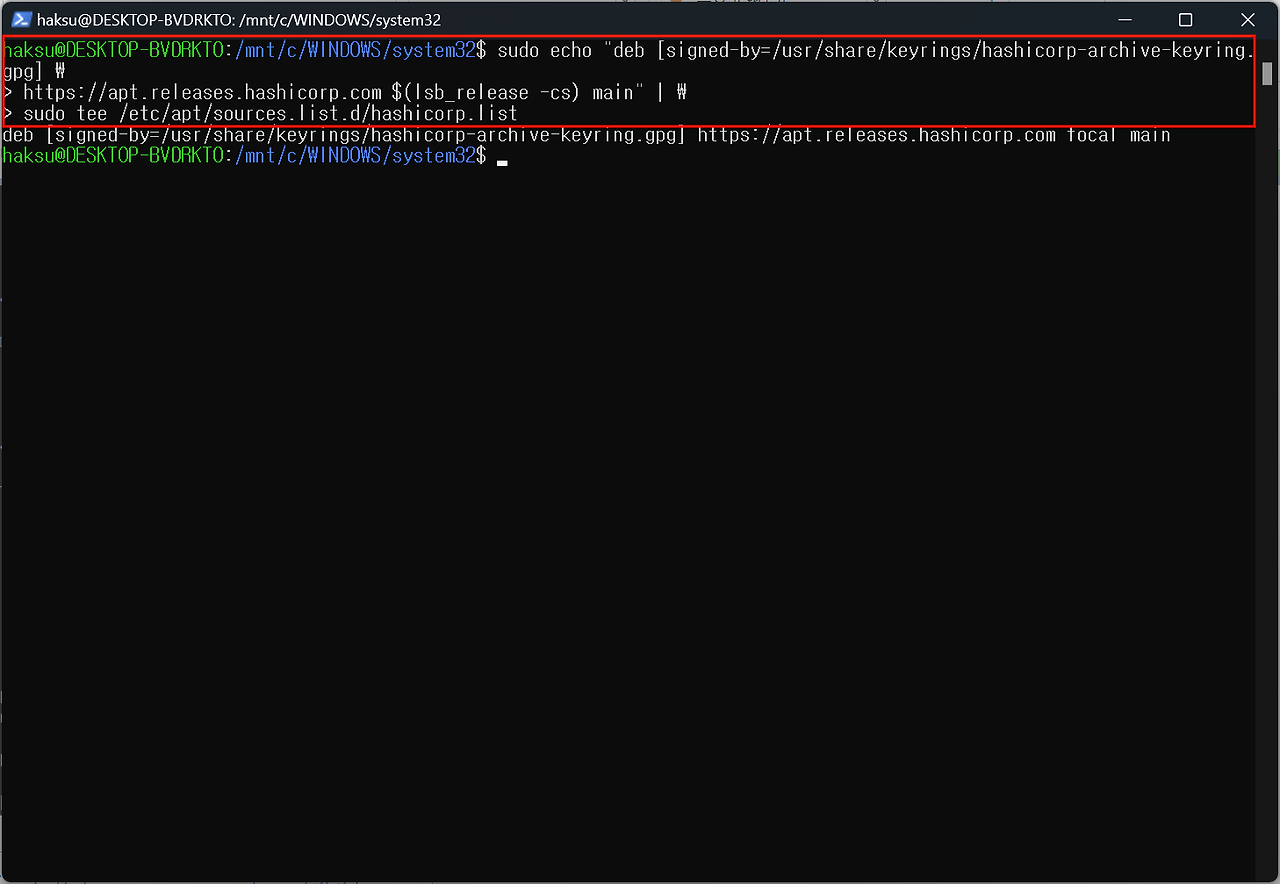 sudo echo "deb \[signed-by=/usr/share/keyrings/hashicorp-archive-keyring.gpg\] \\ https://apt.release.hashicorp.com $(lsb\_release -cs) main" | \\ sudo tee /etc/apt/sources.list.d/hashicorp.list
