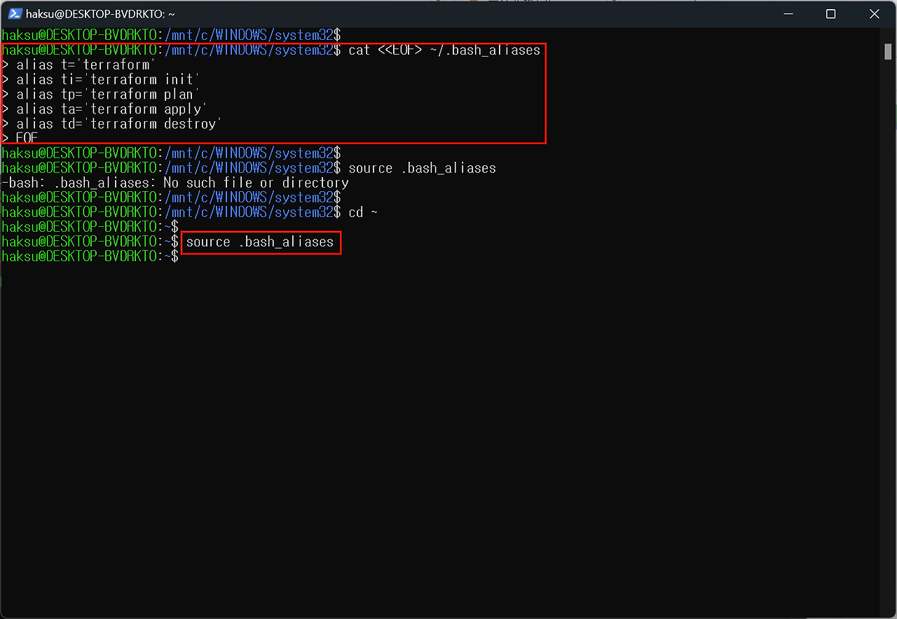 cat <<EOF> ~/.bash\_aliases alias t='terraform' alias ti='terraform init' alias tp='terraform plan' alias ta='terraform apply' alias td='terraform destroy' EOF source ./bash\_aliases