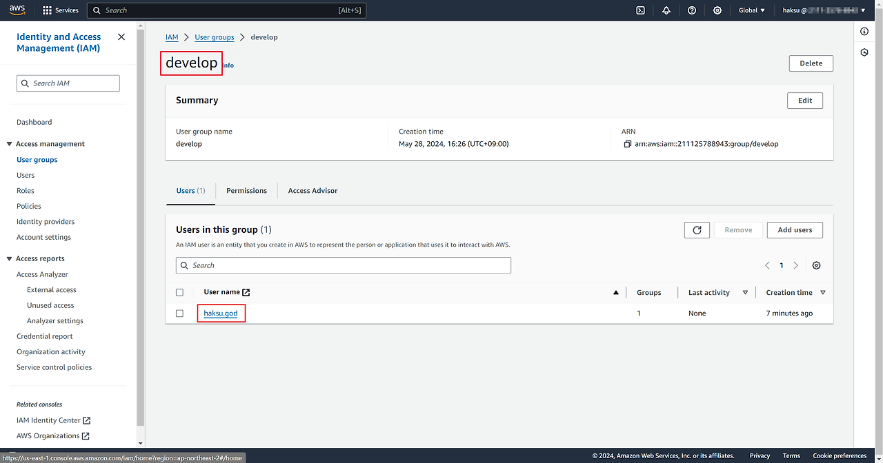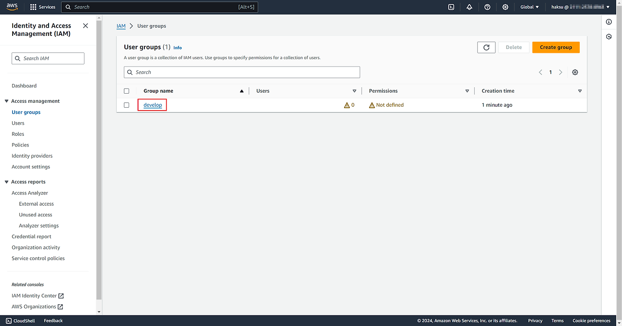 // 생성한 develop IAM 그룹에 생성한 정책 Attach