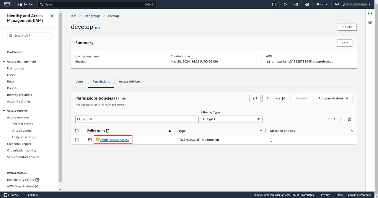 - AdministratorAccess 권한을 가진 정책 생성 및 develop 그룹에 Attach -> AdministratorAccess 권한은 root 계정의 권한과 동일하다고 볼 수 있으니 꼭 필요 최소 권한만 부여하기(실습용으로만 부여)