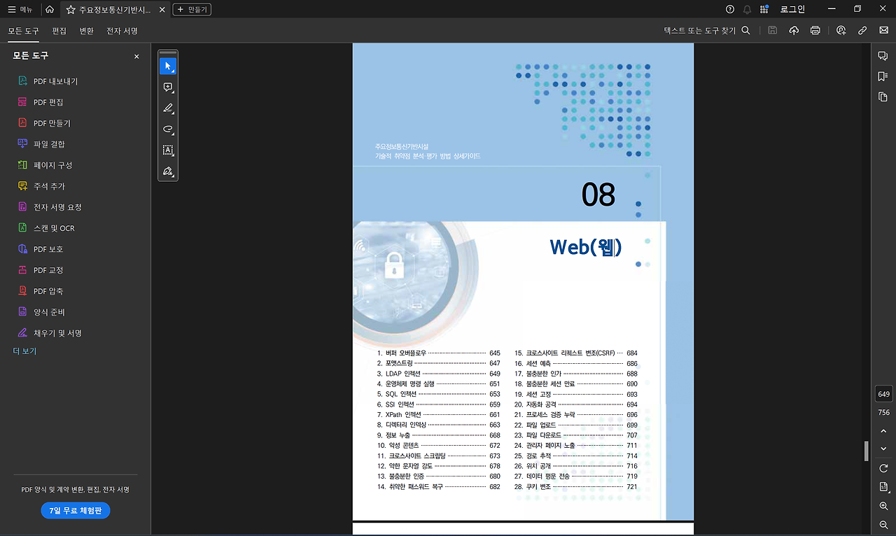 - 주로 웹 환경에서 발생할 수 있는 취약점(정보노출, 악성 파일 및 스크립트, 보안 취약점 등)을 연구